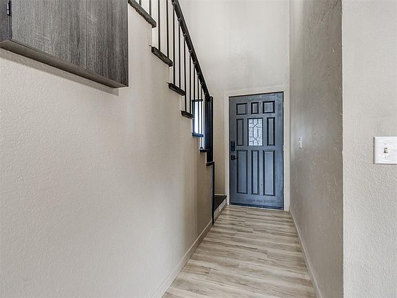 Welcome home! This gorgeous home on a corner lot has been almost completely remodeled inside and out! Once arriving you'll find great curb appeal on this corner lot with new landscaping and light fixtures, fresh exterior paint, and a new roof and gutters that were installed in 2023. Step inside to find so many updates...new paint (including walls, doors, and baseboards) and custom blinds throughout, new light fixtures and fans, door hardware, and new luxury vinyl plank floors. Tons of natural light flood this open concept floor plan. Spacious living room with gas fireplace and vaulted ceiling with a rustic wood beam. Nicely appointed kitchen features new cabinets with soft close and hidden drawers for added storage, tile backsplash, a built in pantry, a kitchen faucet with 3 settings including rainfall, and hidden fans in the light fixtures. Cute half bath off the living room. The primary suite is also nestled downstairs and features an updated bathroom with a new vanity, mirrors, toilet, and tile tub/shower combo with an extra deep soaking tub plus 2 separate closets, and a linen closet. Cute half bath hidden downstairs off the open living area for guests. The stunning staircase leads you upstairs with a new stair rail and treads. Upstairs you'll find two more spacious bedrooms and a hall bath. The yard offers an open patio off the living room and a covered side patio with access from the kitchen. Other new features include a new water heater, new decking and insulation in the attic, a keyless front door lock, and a smart thermostat. There is also a storm shelter in the garage floor. This wonderful neighborhood includes 3 swimming pools...one is just steps away from your home! The beautiful walking trails at Bluff Creek Park are just a few blocks away. Amazing location within minutes of tons of restaurants and shopping, medical facilities, the Kilpatrick Turnpike, the Hefner Parkway, and so much more! This one won't last long so don't hesitate!