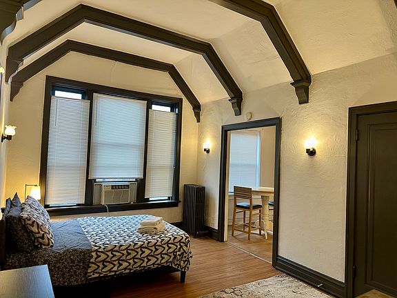 This studio apartment has vaulted ceilings with wooden beams and a lot of historic charm. The unit is on the 3rd floor with plenty of light.