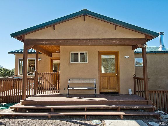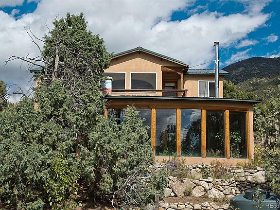 Light filled 3 bed, 1.5 bath tucked deep into a secluded forested cul-de-sac in Chalet II of the Baca Grande Neighborhood. Sweeping views of the San Luis Valley surround the house on three sides, while the fourth side presents the grandeur of the Sangre de Cristo Mountains. Built into the side of the hill and with abundant south facing windows, this house was designed like and Earthship to handle the bitter cold nights with passive solar heat, supplemented with on-demand, 4-zoned radiant hot water heat throughout the house, and a beautiful Kiva in the living room. The same design keeps the house cool in the summer with airflow through the windows. The home was originally designed by Steve Elliott in 1998 and only with one previous owner, with the greenhouse and sunroom addition designed by green architect Michael Bertin. The open concept living space features exposed wood beam vaulted ceilings, stucco archways, white oak and tile floors, and some of the best views of the region. The beautiful open concept space includes a large chef’s kitchen and desk nook, both of which open to separate balconies overlooking the mountains and valley. Downstairs, the three bedrooms share a large bathroom, while the primary opens to a beautiful sunroom with its own Morso high efficiency wood stove. To generate additional heat and grow food all year round, a large attached south facing greenhouse overlooks the outdoor gardens, and generates heat year round. Nestled inside the greenhouse is a 6” diameter wood fired hot tub, with the additional green feature of draining into a 400 gallon cistern to water the gardens. Ample, terraced gardens below the home include 5 heirloom apple trees, while the greenhouse grows frost sensitive plants year round without any supplemental heat: rosemary, citrus, avocados, tomatoes. Additional features of the home include 6” walls with fiberglass insulation, a new metal roof, and an 18’ x 12’ insulated storage building. Check out the virtual tour!