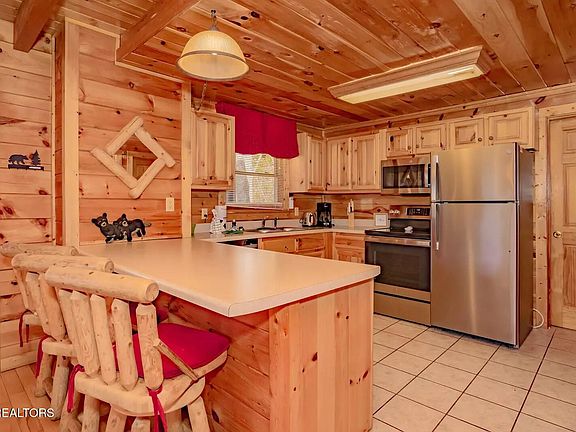 The cabin has an open concept with well-appointed kitchen featuring stainless appliances and a bar that seats 3. Your dining area has a table that seats 4. Living area has a lovely stone fireplace, this area is perfect for an evening dinner or game night.