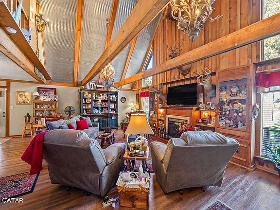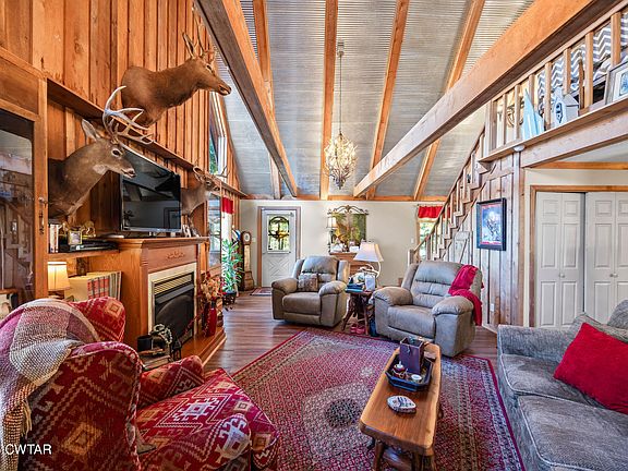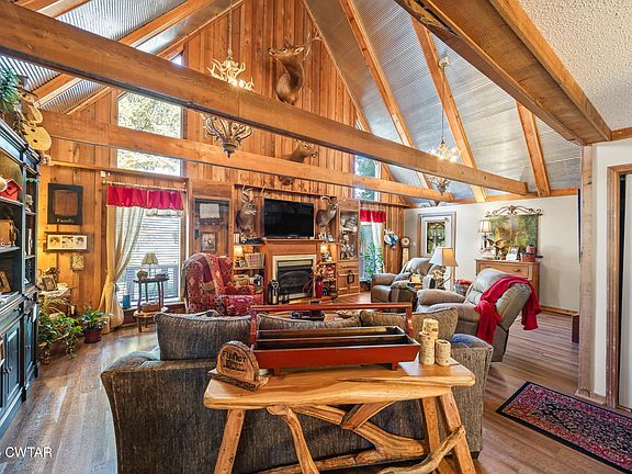 Welcome to your peaceful retreat on a wooded lot! This beautiful 2-bedroom, 2-bath home is tucked away on 1.7 private, wooded acres and offers the perfect blend of comfort, character, and functionality. Step inside to an open floorplan that feels both cozy and spacious. The main floor features a bright eat-in kitchen with a large breakfast bar, pantry, and all appliances included—yes, even the refrigerator, washer, and dryer stay! The living area boasts tall vaulted and beamed ceilings, a cozy gas fireplace, and a warm, welcoming atmosphere. One bedroom and full bath are located on the main level, while upstairs you'll find an oversized second bedroom with its own living space, walk-in closet, full bath, and private balcony—the ideal spot to enjoy your morning coffee or unwind in the evening. Outside, the wrap-around covered porch invites you to relax and enjoy the peaceful surroundings. The property also includes a circle driveway, detached carport with storage and electricity, a separate shed (also with power), and a well-equipped shop with water, electricity, and heat/air—perfect for hobbies or home projects. And for peace of mind, there's even a walk-in storm shelter. This property offers modern amenities with rustic charm, all in a beautiful natural setting.