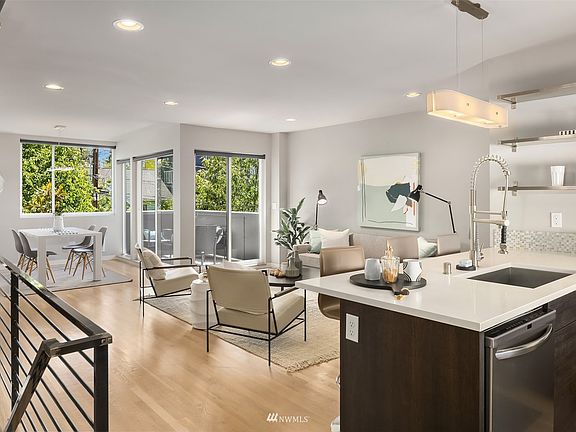 Modern townhome in the heart of Wallingford with city and territorial views. High-quality construction with steel fabricated staircases and solid oak hardwoods throughout. First floor features a generous open floor plan and dining room, ½ bath, plus sun-filled south facing covered deck. Kitchen w/gas range, quartz counters, and ample storage. Upstairs, a primary suite with full ensuite bath and view balcony as well as 2nd bedroom and ¾ bath w/custom tile shower. Entry on main floor with SE view bedroom/office and ample 1-car attached garage. High-efficiency radiant floor and hydronic heat system powered by Nest. Walk to nearby restaurants and shops, commute and bike-friendly neighborhood. Walk score 94!