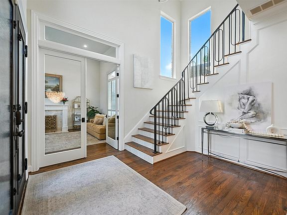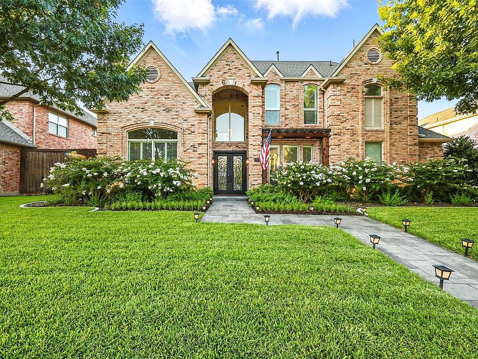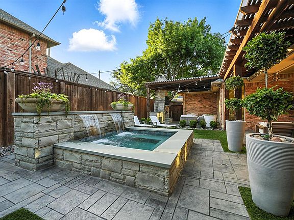Stunning luxury home with exceptional curb appeal and multiple outdoor living areas. Behind the striking double iron-and-glass front doors, hardwood floors lead through an inviting entry accented by modern iron balustrades and an updated chandelier. The formal dining room is perfect for gatherings large or small. The adjacent office or living room showcases a marble fireplace, architectural windows on both north and south walls, and glass French doors for privacy and a transom for added light and openness. The kitchen is a true showpiece. It features marble countertops, white Shaker cabinetry, and top-of-the-line Wolf appliances, including a six-burner gas range with griddle, double oven, and commercial-grade vent hood. Additional highlights include a Kohler farmhouse sink with Moen faucet. The adjacent breakfast room has a built-in china cabinet with a Sub-zero wine refrigerator. The kitchen opens seamlessly into a warm family room with a beamed ceiling, built-in cabinetry, gas fireplace, and wet bar with marble counters and wine storage. The primary suite offers a serene retreat with hardwood flooring, remote-controlled blinds, and French doors leading to a private patio. The spa-inspired bath includes marble counters, shower with dual showerheads, a whirlpool tub with air massage, smart mirrors, and a custom-designed closet with extensive storage and locking drawers. The second bedroom downstairs is split from the master to make a perfect guest room or nursery. Upstairs, you’ll find a spacious game room, two additional bedrooms with walk-in closets, and a shared updated bath. Outdoors, enjoy resort-style living with all-synthetic turf, a covered patio with cedar pergola, built-in grill, fireplace, and a plunge pool with whirlpool jets and water feature. Every system has been meticulously updated—from attic ventilation and gutter screens to freshly painted interiors (2025)—ensuring a move-in-ready masterpiece of comfort, elegance, and modern luxury.