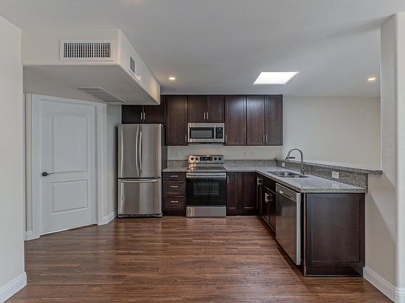 Unit includes 8', floor to ceiling, sliding doors leading out to oversized private patios with a firepit in the front. Both patios have 6' tall walls for privacy, and are great for keeping pets safe. Condo quality finishes throughout: kitchens with 42 inch espresso cabinets and high-end granite counter tops with stainless steel sinks, under-cabinet accent lighting, Samsung stainless steal appliances, and USB charging ports. Unit has WI-FI thermostat controllable from your phone that automatically adjust the temperature based upon your location. The bathroom is extensively tiled and includes a high-pressure Delta shower head. The unit also includes a new high-end, full size Samsung washer and dryer. The flooring is hand-scraped walnut wood-laminate flooring throughout the open floor plan.