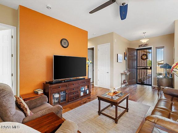 Tucked into the friendly Granville community, this inviting stucco home captures attention from the start with its charming curb appeal, mature shade trees, and easy-care landscaping that complements the neighborhood's natural beauty. A welcoming walkway leads to the covered entry, setting the tone for the pride of ownership reflected throughout the property.Inside, the spacious great room makes an immediate impression with its soaring ceilings, rich newer engineered hardwood flooring, and abundant natural light. A cozy corner fireplace in the dining area anchors the room, creating a warm gathering space that flows seamlessly from the living area into the kitchen creating a space perfect for both casual meals and entertaining with ease.The kitchen is thoughtfully designed for everyday comfort and functionality. It features granite countertops, a breakfast bar, stainless steel appliances including a 4-burner gas range, and a pantry for extra storage. The primary bedroom is a quiet retreat that is generous in size and offers an ensuite bathroom with a dual-sink vanity, upgraded counters, a walk-in closet, and a step-in shower. Two additional bedrooms provide comfortable accommodations for guests, family, or a home office setup, and they share a full bathroom with updated finishes. A dedicated laundry room offers convenient access to the attached 2-car garage.From the dining area, sliding glass doors open to a backyard sanctuary that feels unexpectedly lush and inviting. A covered patio provides shade for relaxing outdoors, while an extended paver patio invites gatherings under the stars. Mature trees frame an artificial turf lawn, and a raised garden bed offers space for growing vegetables, herbs, or flowers, ideal for anyone who enjoys spending time outdoors.Located within walking distance of Iron King Trail, Granville Dog Park, and neighborhood parks, this home offers unmatched access to recreation and outdoor enjoyment. Just minutes from Prescott Valley's vibrant shopping, dining, and entertainment and with an easy commute into Prescott, this move-in ready home delivers comfort, convenience, and Arizona living at its best.