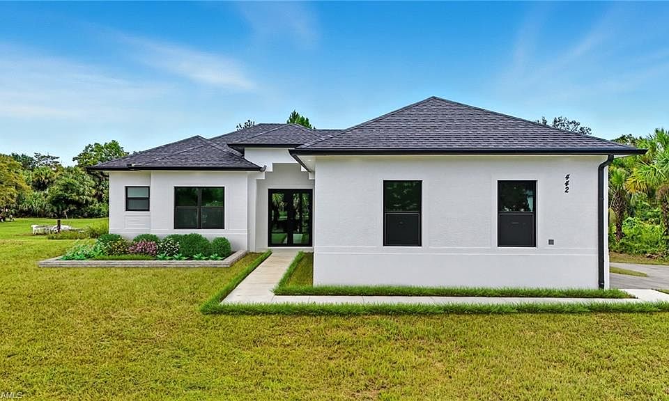 Experience modern luxury living in this beautifully crafted 3 bedroom + den/study, 2 bath home, thoughtfully designed with style, comfort, and functionality in mind in the sought after Golden Gate Estates. Nestled on an upland lot and just two streets off Wilson Blvd, this home combines the tranquility of spacious living with the convenience of being close to shopping, dining, and everyday amenities. Step inside to an open-concept floor plan featuring a designer kitchen with a large island, sleek countertops, and premium stainless steel appliances—perfect for entertaining family and friends. Natural light pours through impact-resistant windows and doors, highlighting the elegant tile flooring that flows seamlessly throughout the home. The primary bedroom is complete with a walk in closet and an ensuite bathroom with double sinks and a custom tile walk in shower. Every detail has been carefully selected, from the high-end finishes, accent lighting and ceiling fans to the whole-house reverse osmosis system already installed for your comfort. Outdoors, the expansive 2.27-acre lot offers endless possibilities—whether you envision a pool, garden, or simply space to enjoy Florida’s natural beauty. This newly completed home embodies true craftsmanship and is ready for you to move right in and start living the Naples lifestyle.