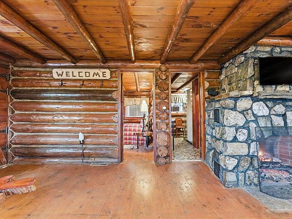 Large stone hearth fireplaceRustic furnishingsReal log homeAuthentic two-bedroom one-bath retreatWarm wood tonesThoughtful updatesOn-demand backup generator