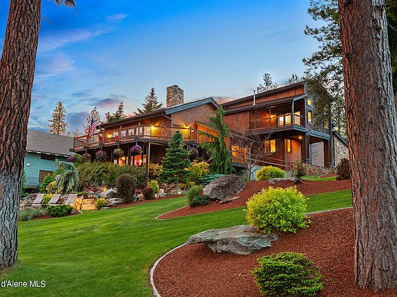 Prestigious Waterfall Estate on .99 of an acre with 165+ feet of prime, deep waterfront with plenty of space to build a shop or additional dwelling unit. Home was totally remodeled in 2022 & is nestled between rock cliffs & a 65 acre wildlife park with private entrance. This stunning home has 5816 sq. ft. of refined architecture & features one of the region's most spectacular landscapes. Views from the expansive deck include a 20' natural rock waterfall, Mica Peak, in-ground hot tub/pool, stone fire pit, boat dock with lift, jet-ski docks & the Spokane River. Interior includes a top floor that serves as a sanctuary, housing only the master suite with a private balcony & stone gas fireplace as well as a sophisticated office with built-in custom cabinets. Enjoy two main floor masters, log bunk room, chef's kitchen, stone arched wine cellar, meticulously designed bar, game room, 3 car heated garage & other amenities. Best of all, it's a quick & beautiful boat ride to Lake Coeur d'Alene