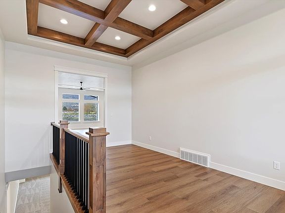 Stunning new Farmington home with 4,797 sq ft, 4 beds, 3 baths, and bright, open living spaces. Features 10' ceilings on the main level, 8' doors or 6'8" doors with transom windows above on the main level, coffered ceilings with faux beams, and a gourmet kitchen with double ovens, 36" cooktop, built-in microwave, and hidden-door pantry. Basement includes a full kitchen and finished theater room. Spacious layout, large laundry room, and quality finishes throughout. Prime location near Farmington High and walking distance to Station Park.