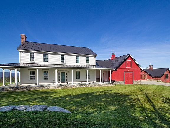 Sunset Ridge, situated on 20+ acres with one of the most picturesque settings in our valley, with spectacular sunsets and mountain views. A custom Farmhouse built by The Wadsworth Company in 2017 with attached heated three car garage and detached two level timber framed barn with under ground tunnel connecting to the lower level of the home.  Step directly from the garage into the spacious mudroom with antique brick floors and cubbies for everyone to keep their gear organized.  Gourmet kitchen with Wolf stove and oversized island provides a great space for making warm waffles on a snowy weekend in Vermont. Wide plank, brushed oak floors and hand hewn beams in the ceilings give the home a mountain rustic feel but retaining the charm of the classic farmhouse.  Warm up in front of the stone fireplace or retreat to the office/study for a great work - from- home space. Master bedroom and bath captures the magnificent mountain views. Two additional bedrooms are located on the second level. The finished lower level is a great space to escape and features the custom bunk room. Laundry is located on both the second level and full service laundry room on the basement level.  Take your entertaining outside to the screened in porch with built in pizza oven and grilling station.  The stone patio with fire-pit is enhanced with outdoor speakers and the best spot to capture the setting sun and the fireflies once the dark skies set in.