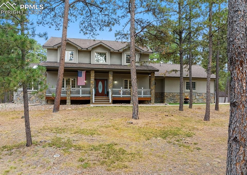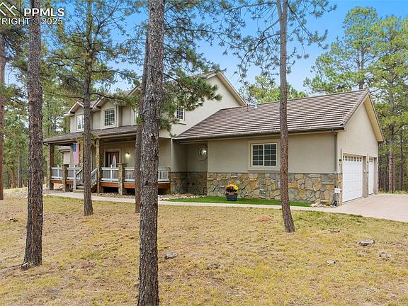 Welcome to this stunning Wissler Ranch property on a beautifully treed 2.77-acre lot where privacy and natural beauty come together. Fire mitigation is already completed, giving you peace of mind while you enjoy the Colorado lifestyle. This spacious 5-BR, 4-BA home offers thoughtful design with a main level office or sunroom, finished basement, and a 3-car finished & heated garage with car lift included! Step inside to find beautiful wood flooring throughout the main level, primary suite, and upstairs hallway, complemented by 9’ ceilings for an open, airy feel. The updated kitchen is a true centerpiece, featuring a beech island, soapstone countertops, hickory cabinets, gas range, and pantry. A designated dining area includes built-in cabinetry for storage and serving space. The great room is warm and inviting with a gas fireplace, built-in wet bar with granite countertops, and high end wine fridge. A powder bath and laundry/mud room with bench plus washer and dryer included complete the main level. The spacious primary suite features vaulted ceilings, a luxurious ensuite 5-piece bath with quartz countertops, jetted tub, shower with slab quartz walls for easy cleaning, and a walk-in closet with built-ins. Upstairs you’ll find two additional bedrooms and a full bath. The finished basement with 9’ ceilings provides additional living and entertaining space with a gas fireplace, walkout to a large patio, two bedrooms with walk-in closets (one with custom wine storage), full bath, and plenty of storage. Enjoy Colorado’s outdoors with multiple deck and patio spaces, a storage shed, and a durable Decra metal shake roof. Located in Wissler Ranch, you’ll appreciate the community park, playground, and walking paths—all with easy access to both I-25 and Hwy 83 for a convenient commute to Colorado Springs or Denver.