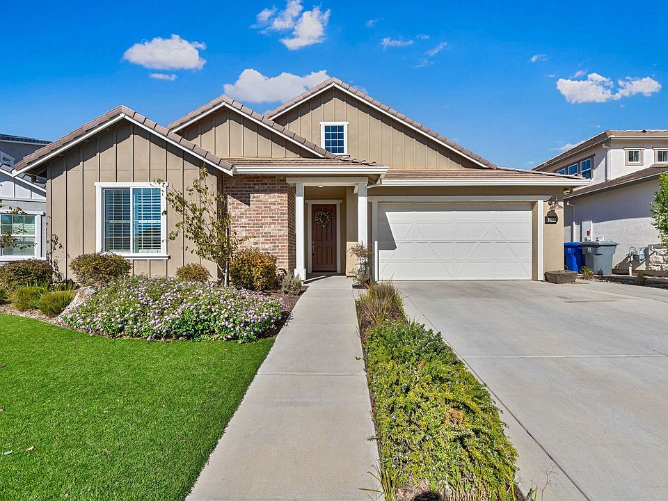 Folsom Ranch gem! This immaculately maintained single-story home in Folsom Ranch offers 3 bedrooms, 2.5 bathrooms, and 2,389 square feet of luxurious living space. Built in 2019, the home combines modern amenities with timeless design. The open-concept layout features elegant tile flooring throughout, designer light fixtures, and a spacious living room with a cozy fireplace and large sliding doors that open directly to the backyard.