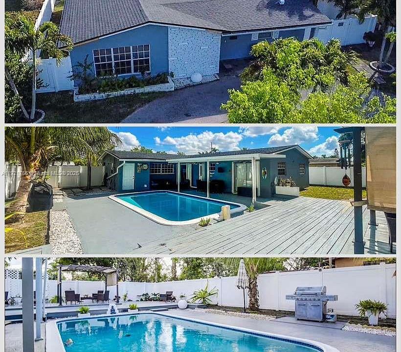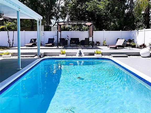 Impeccably upgraded 3BR/2BA entertainment home with BRAND NEW ROOF (Feb 2025), fully renovated POOL (2023—new plumbing, electric & resurfacing), & circular driveway (refinished 2022), offered tastefully FURNISHED. Enclosed by 6-ft PVC privacy fence, Backyard Oasis features 300-ft covered outdoor living/dining area; sealed, 2-tier wood deck (reinforced for future jacuzzi) with shaded Pergola, & BBQ patio. Pool access from living room, guest bath & primary. Open living/dining, bright kitchen, stainless appliances, impact windows/doors, tankless water heater, central AC (2019), indoor laundry. Washer/dryer, outdoor shed convey. Roof & pool warranties are transferable.