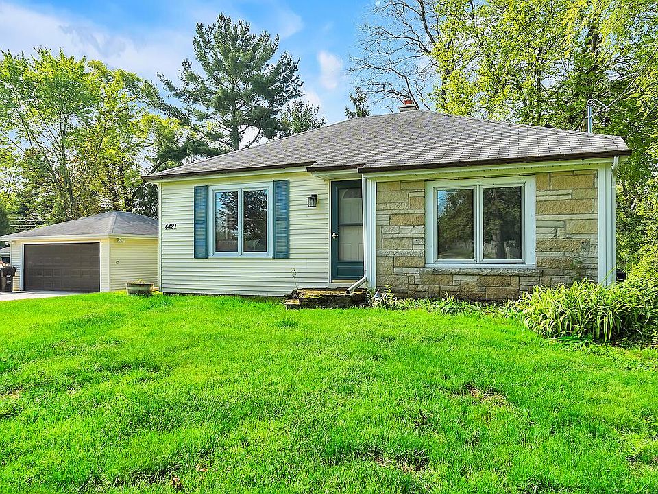 Hard to find Caledonia Ranch w/ character! Located on a generously sized, private lot w/ huge 2.5 car garage. Main living area features hardwood floors, overhead can lighting, & ample natural light. Kitchen features a new countertop, ss appliances, overhead wood beams, & space for small table. Beautiful, recently updated full bath w/ stand up tiled shower, new vanity, & plumbing fixtures. Two decently sized bedrooms complete the main level. Basement offers an additional finished room along with laundry & extra storage. Hard to find a better backyard & lot at this price point. A few trees for privacy & plenty of room to enjoy the outdoors this summer. Newer concrete driveway. XL additional storage shed. This listing is sure to not disappoint!