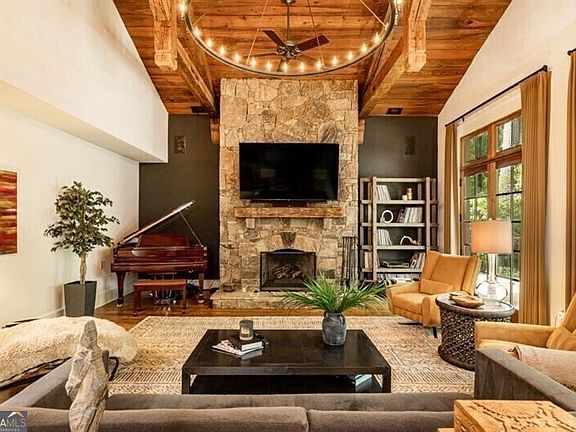 Escape to this remarkable property sitting on over an acre of land with a serene stream as your back drop. Curated to perfection this home offers an elevated lifestyle close to heart of Vinings. Walking through the front door you enter the great room with beamed ceiling, floor to ceiling stone fireplace and beautiful views of the canopy of trees that surround the property. The overside separate dining room features wood barreled ceiling and nearby butlers pantry making it perfect for family gatherings and entertaining. The Design Galleria kitchen is perfection with dining area, kitchen island, built in office, Sub-zero and wolf appliances, wet bar, separate drink drawer, farmhouse sink, stacked stone backsplach & limestone vent hood. Conveniently located of the kitchen is the mud room with ample cabinet space and sink. A peaceful Yoga-sunroom just off the kitchen offers a view of the entire property. Tranquil primary bedroom with sitting area & limestone fireplace are located on the main floor. Two additional bedrooms with tiled bathroom and a beautiful wood paneled library with fireplace are also on the main floor. The main floor opens to wrap around rear deck and Pavillion give full with views of the stream and offer an unbelievable setting for any gathering. The second level offers two additional bedrooms and two additional entertaining spaces including a large sitting area with fireplace, game room and two full bathrooms. The newly completed terrace level with half bath offers room for a gym, home office,workshop, studio etc.and has a separate entrance that opens to the stream and backyard. The home has a two car garage with artist studio and also an additional covered parking spot with a storage shed. The home and property work together to bring a harmonious way of living. Some of the property upgrades include the completed terrace level with bathroom, new lighting, new decking, kitchen upgrade and new generator.