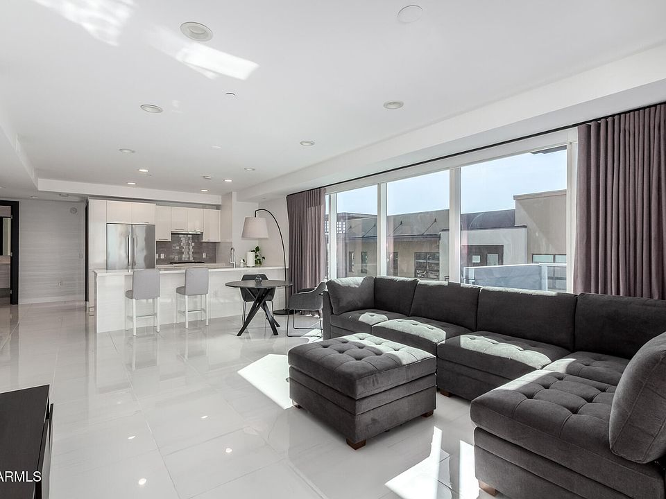 A blend of luxury and convenience! This stunning 2-bedroom condominium comes fully funished and boasts a captivating open layout with high ceilings, subtle recessed lighting, floor-to-ceiling windows for abundant natural light, and oak wide plank hardwood floors and Italian porcelain tile throughout. The gorgeous kitchen comes with beautiful quartz counters, Goldreif by Poppenpohl cabinetry for a modern look, SS Bosch appliances, and a peninsula with a breakfast bar. The primary suite offers breathtaking views of Camelback Mountain, an ensuite with double sinks, and a walk-in closet. Outside there's a wrap around Terrace with Gas Grill hook up. Delightful Community amenities include a recreation center, 4,000 sq ft state of the art Lucas James designed fitness center, Outdoor zen garden, yoga studio, resort-like pool and spa and Black Label Lounge and Bar, and 24/7 security and conciege service. Desirable location close to shopping options, bus stops, delectable restaurants, and access to downtown Scottsdale. Unit includes 2 underground secured parking spaces. Don't miss out on this fantastic opportunity!