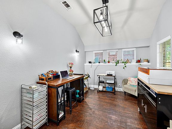 This stunning single-story home blends comfort and elegance with its open-concept design and hand-scraped wood floors. A welcoming covered front porch leads into a spacious entryway, where French doors open to a private study—perfect for a home office or quiet retreat. The heart of the home features a bright, open living area with tall ceilings and an effortless flow into the kitchen and dining spaces. The gourmet kitchen boasts granite countertops, a large island, stainless steel appliances, a pantry, and an inviting eat-in dining area—ideal for casual meals or entertaining guests. The luxurious master suite offers a peaceful escape with dual sinks, a garden tub, a separate shower, and a generous walk-in closet. Additional bedrooms are spacious and filled with natural light, providing comfort and flexibility for family or guests. The home also features a large utility room with built-in cabinetry, a three-car garage, beautifully landscaped surroundings, and fresh upgrades including a new fence, lighting structures, and a fully remodeled bathroom. Enjoy outdoor living year-round on the covered back patio with a ceiling fan, TV wiring, and a cozy fire pit—perfect for relaxing evenings.