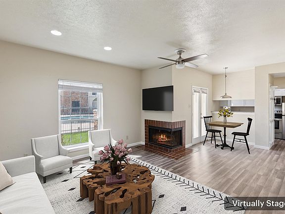 Cozy fireplaceLaminate wood flooringStainless steel appliancesDining areaGranite countertopsStackable washer and dryerNatural light