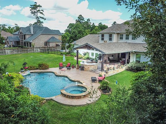 Vacation year round in THE BEST backyard oasis available! You won't believe your eyes and it's perfect for entertaining! Extended covered patio, outdoor kitchen, outdoor fireplace, sparkling pool w/spa, and private backyard. Indoor you will find luxurious finishes, plantation shutters, wood floors, and abundant natural light. Unique floor plan with downstairs game room and an additional game room or media space upstairs! The private executive study is perfect for your virtual office. Impressive kitchen for the gourmet chef includes stainless appliances, gas stove top, and endless counter tops with gorgeous granite. This home has five full bedrooms, all with direct access to a bathroom! Master & 2nd Bed down w/private en suite bath. This home has access to the exclusive Estates clubhouse, fitness center, pool, splash pad, sports park, and playground. Minutes from The Woodlands Town Center, Exxon Campus, & IAH. It's priced to sell and available to close quickly!