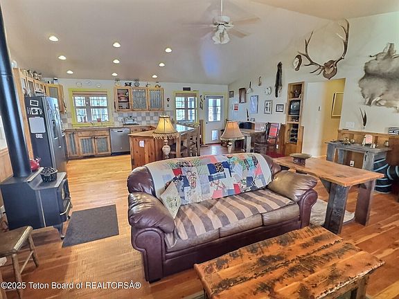 The property can easily accommodate horses and is currently fenced for dogs. Mature trees and native grasses are maintained by sprinklers that operate on irrigation but can be switched to well. The west deck is shaded for those sunsets over the Big Holes.