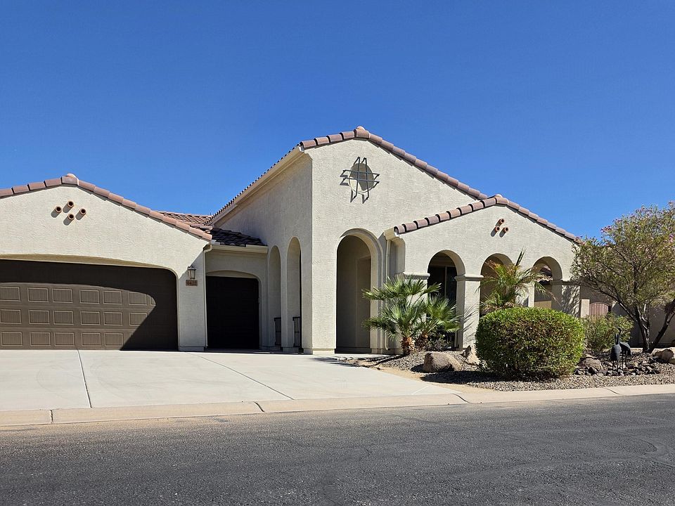 This popular Pavona model is furnished and ready to move in. Featuring a big, open floor plan with upgraded kitchen appliances and cabinets, under cabinet lighting and beautiful quartz countertops. The front bedroom suite with private bath is perfect for out-of-town friends and family. In the back, you can enjoy the desert landscaping and water feature from the large, covered back patio that is fully screened for year-round use or from the private, paved seating area off to the side. This home features a two-car garage with an extended driveway plus a separate golf cart garage and entry. Come and take a look!!