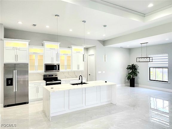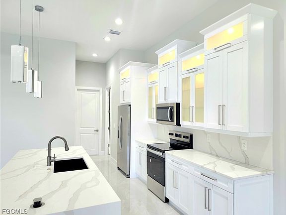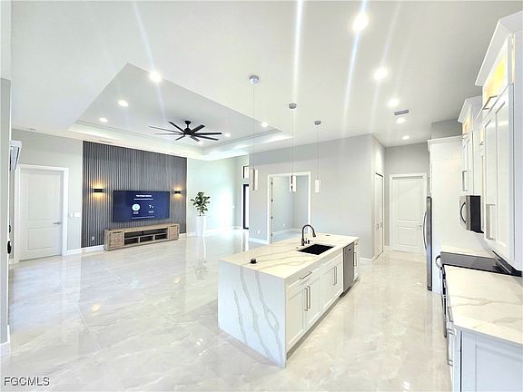 Brand new, move-in ready home with a pool in the highly sought-after NW Cape Coral area. This 3BR/3B home with a den boasts a modern open floor plan, creating a light and airy atmosphere throughout. The kitchen is equipped with shaker-style all-wood cabinets, new stainless-steel appliances, and modern quartz countertops. The main open living room features an upgraded ceiling and entertainment wall. The backyard offers a screened-in patio and pool overlooking lush palm trees and upgraded landscaping with a fenced in yard. Situated across from waterfront, in a rapidly developing neighborhood.