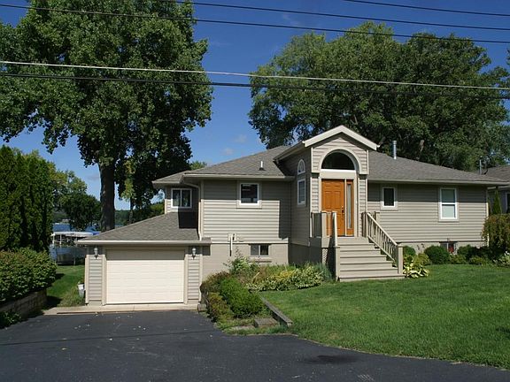 Floridian style lakefront on quiet cove of Delavan Lake. Remodeled master bedroom suite with jetted tub, private screen porch, wood floors and gas fireplace. Open concept kitchen and great room with cathedral ceilings, lake views and walk out to expansive deck. Cozy office nook with water views. Walk out lower level with third bedroom, spacious recreation room and full bath. 83 feet of level frontage, over-sized pier and two boat slips. Attached two-car tandem garage off of lower level laundry room. Excellent condition throughout.