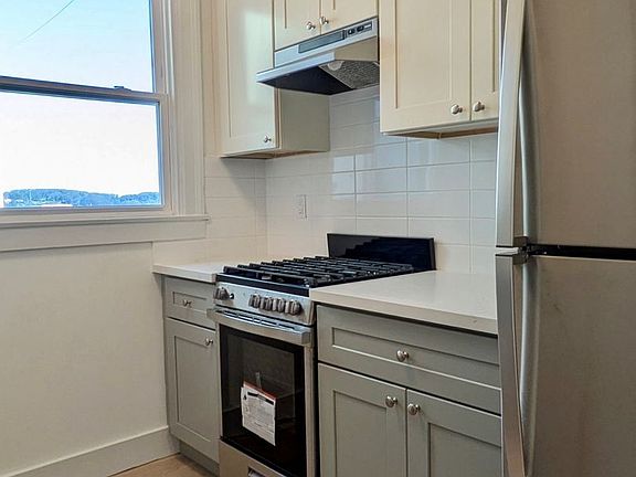 Remodeled studio apartmentKitchen with quartz countertopsStainless steel appliancesNewly refinished hardwood floors
