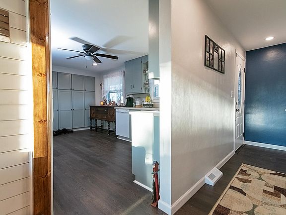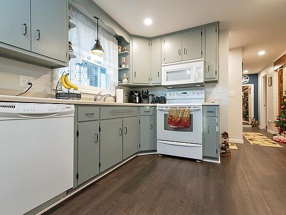 Kitchen has been updated with fresh paint on all the cabinets, walls, and trim. All new flooring and overhead lights also added a paddle fan.