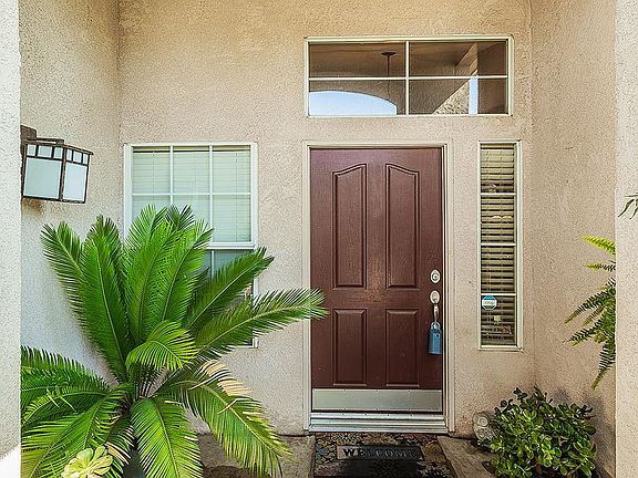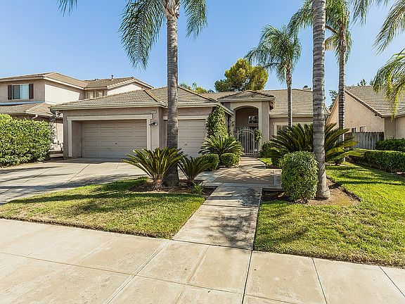 This lovely 4 bd 2 bath home offers the perfect blend of space, functionality and style. There is a recent $10,000 price adjustment! Seller also recently installed a new LENNOX air conditioner with a 10 yr warranty (which is saving money on energy bills.) It has a 3 car garage, which is an ideal space for storage or a workbench. Generous living areas, modern updates, and a thoughtful floor plan make this home ideal. Upon entering you will find a bright airy living room, a spacious dining area and an inviting family room with a fireplace. The kitchen has recent appliances including the stove, garbage disposal, dishwasher, the refrigerator which will stay, a recent sink faucet, ample cabinetry, spacious counters, and an inviting breakfast bar. Fresh paint, French doors, ceiling fans, and a lovely hall chandelier all add to the decor. Two baths feature recent comfort height toilets and double sinks. The primary bth has a sunken tub. Primary bdrm has a walk in closet. The faucet in the laundry has also been replaced. Beautiful mature front yard landscaping with recent sprinklers. The private back yard has a covered patio, a relaxing spa, a recent fence, fruit trees, and room for gardens or a play area for children. A Mediterranean design with a security gate, a tile roof, and a well kept neighborhood that is close to shopping and schools make this a great house at a great price!