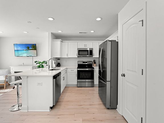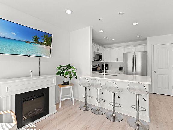 Kitchen: white cabinetry, quartz-style counters, stainless appliances, dishwasher, and island seating for 4.