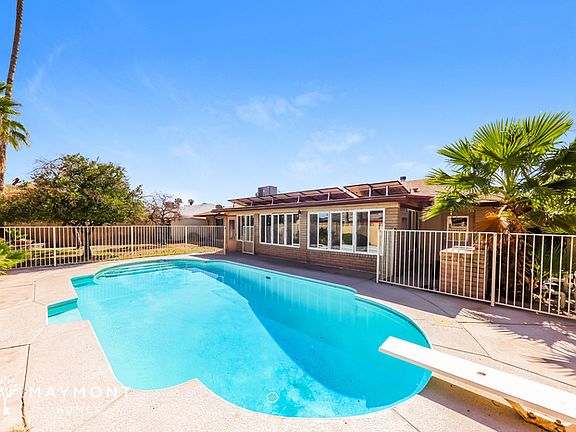 Private poolWhite cabinetryNatural lightBrick exteriorEnclosed sunroomClean desert landscapingBright sitting area