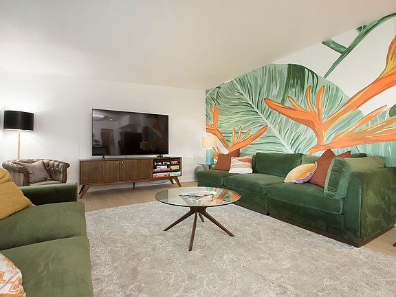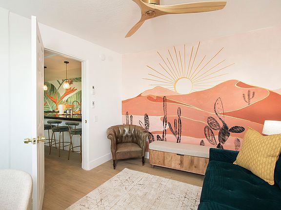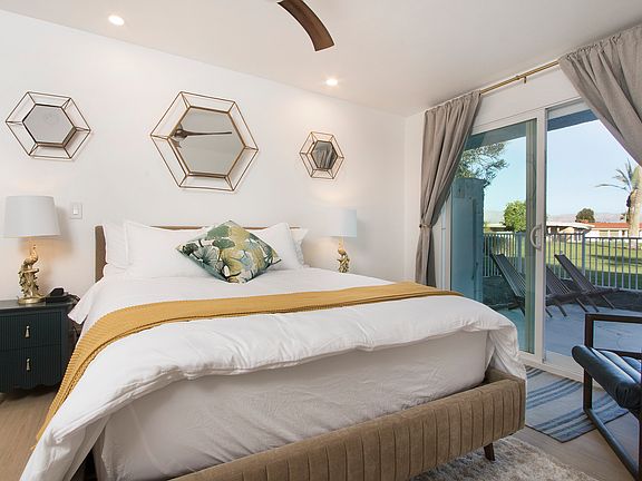 This one-level Mid-Century Modern home in Indian Wells is updated with new appliances, a remodeled primary bathroom, luxury vinyl planks, and murals. All new fully furnished bedrooms, living room, office, and kitchen as well!