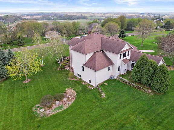 Your own little piece of paradise, less than 1 mile outside of Cottage Grove on 1.50 acres. This beautiful 4-bedroom 3.5 bath home has it all. Enter to views of wide staircase, formal dining room, office with French doors, on to great room with expansive 18 ft ceiling, gas fireplace, opening to dining area, sunroom, large 3 season room (19x14), and chefs kitchen with range, warming oven, and Viking gas stove top, breakfast bar. First floor master suite with separate walk-in shower, and soaker tub, dual vanity, and huge walk-in closet. Main level also features hard wood flooring, bath, laundry, and multiple closets for storage. Upstairs has 3 bedrooms full bath, large storage room. Lower-level features large rec room with wet bar, frig, full bath, large storage area.