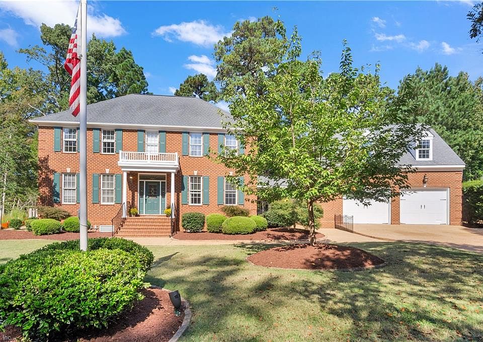 Welcome to a rare offering in The Island at Landfall, where timeless Colonial architecture meets the tranquility of waterfront living in Williamsburg, VA. This stately 5 Bedroom, 4.5 Baths brick estate is gracefully positioned on a cul-de-sac. Evoking the feel of a private retreat with sweeping views of Powhatan Creek. A two-story Foyer welcomes you with natural light. The Formal Dining Room is a visual delight with its semi-circular design and arched windows. The gourmet Kitchen is a showcase of culinary luxury, overlooking a gracious Family Room with a fireplace. First-floor Primary Bedroom Suite provides a serene retreat. A spacious Office or Flex Room offers versatility. Upstairs features four generously sized Bedrooms, two Full Baths and laundry room. Above the oversized two-car garage, an extensive bonus room with full bath and private deck. A private boat and ski lift, wrought iron fencing and fire pit in the backyard. Close to Jamestown Ferry, William & Mary, and attractions!
