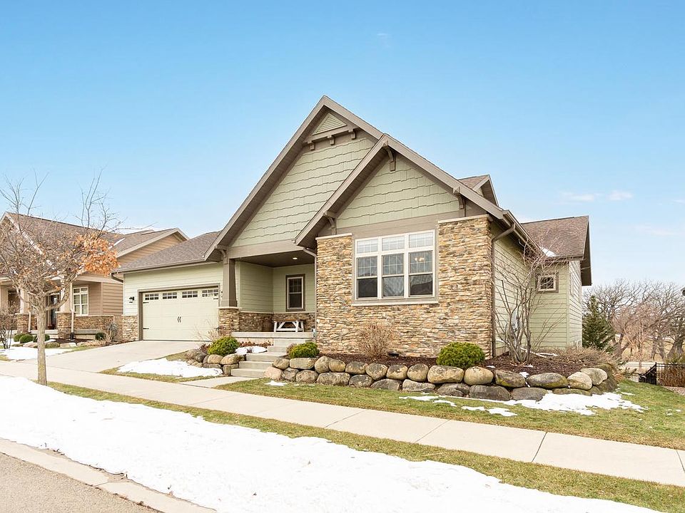 Showings start 4/12 at 3pm. Stunning craftsman ranch home - Bishops Bay. Beautiful sunset views overlooking the park. An open concept kitchen w/large island, dark stained cabinetry, hardwood floors through out main, Cambria Quartz counters. Stunning great room w/coffered ceilings, built-ins & stone gas fireplace. Primary suite boasts nice sized windows w/sunset views. A generous en-suite features two sinks, heated floors, walk in shower, soaking tub & custom walk in closet. The 2nd bedroom is a nice size, adjacent to full bathroom. Lower level offers rec room, two other bedrooms, wainscoting accents & a generous shared bathroom. Tons of room to grow w/plenty more space to finish! Custom paver patio. Surround sound. HOA fee incl pool, fitness & community rm. Nearby acclaimed golf club.