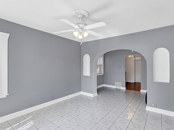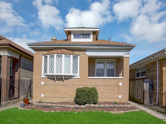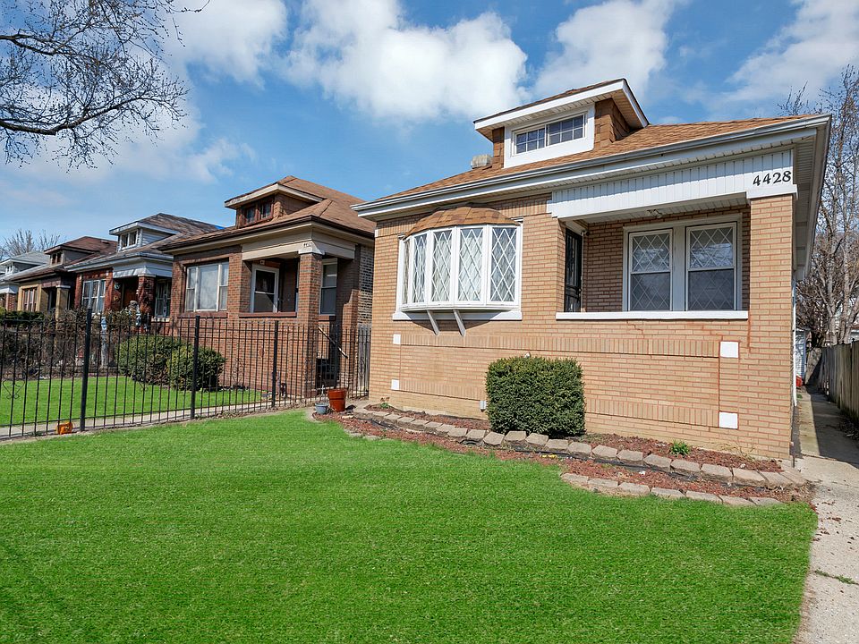 Move right into this well-maintained Chicago bungalow-style home. This home boasts many charming features including; updated painting, decorative arched doorways, and an updated bathroom. The family room features a beautiful bay window which allows natural lighting and leads into a separate dining room with ceramic tile flooring. The kitchen features a double sink, dark wood cabinets, diamond accent windows, and tile flooring. The primary bedroom and second bedroom are on the main floor. The bathroom has an updated modern tiled bath/shower with black and bronze fixtures and a new vanity sink with an original block glass window, allowing for natural light and privacy. The basement adds even more living space with a rec room, full bathroom with garden garden-style jacuzzi tub, and an extra room that could be used as an office space or 3rd bedroom. A satellite dish is included AS-IS. Don't miss this one!