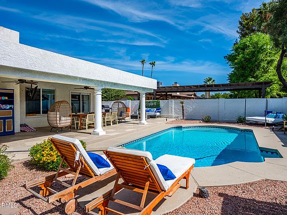 Set on nearly a quarter-acre, south-facing lot, the backyard is an outdoor retreat—complete with a heated diving pool, above-ground spa, outdoor fireplace, lush grassy yard, and a spacious covered patio perfect for gatherings. With no HOA and a prime location, this property offers flexibility and freedom for every lifestyle. Don't miss your chance to make this Paradise Valley gem your new home!