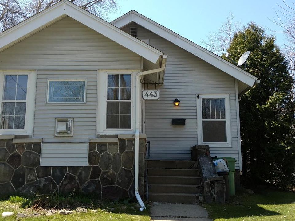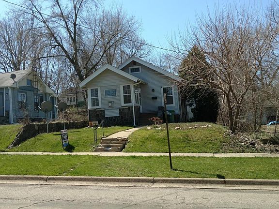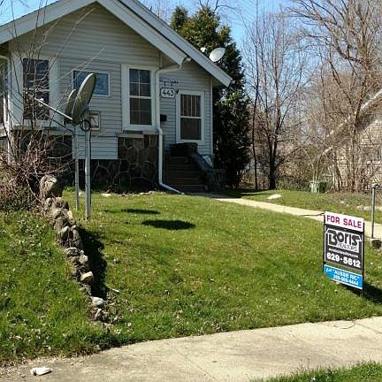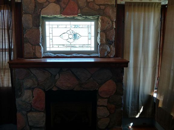 CUTE BUNGALOW WITH SOME REALLY OUTSTANDING EXOTIC ARCHITECTURAL FEATURES.STAINED GLASS WINDOW IN FRONT---WITH SOME BEAUTIFUL STONE IN AN ACCENT WALL--FACING ST.COSY GAS FIREPLACE SURROUNDED BY STONE WITH A PRETTY MANTLE.LARGE FAMILY ROOM,GALLEY STYLE KITCHEN WITH THE ADDED BONUS OF A BREAKFAST NOOK--LOTS OF UPGRADES INC--LAMINATE WOOD FLOORS---BATHROOM HAS A JETTED TUB SERVICING BOTH BEDROOMS UPSTAIRS.BASEMENT IS DRY AND HAS LOTS OF STORAGE THAT COULD BE CONVERTED WITH SOME TLC INTO ADDI TIONAL ROOMS/MAN CAVE--LAUNDRY IN BASEMENT WITH NEWER HOT WATER SERVICE--UPDATED 100-AMP SERVICE BASEMENT ALSO PLUMBED FOR ADDITION BATHROOM--LOTS OF OPTIONS HERE.,FENCED IN YARD WITH REAR ACCESS TO A 1--CAR GARAGE--HOME IS VINYL SIDED WITH NEWER ROOF--LOTS OF ORIGINAL WOODWORK THROUGHOUT.HOME IS MOVE