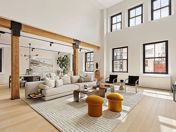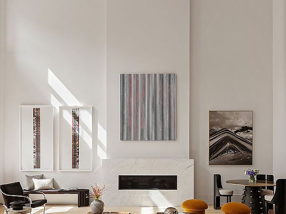A key-locked elevator opens into a marble-clad foyer, leading directly into the luminous great room. Here, soaring double-height ceilings, seven oversized south-facing windows, a marble-wrapped gas fireplace, and exposed reclaimed beams create a dramatic yet inviting centerpiece for the home.