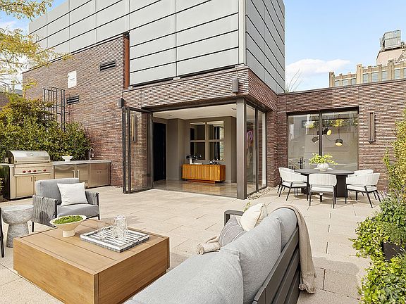 Crowning the residence is a private top-floor lounge framed by accordion glass doors that open to the roof terrace with open southern views of the skyline. Outfitted with a full outdoor kitchen, Wolf grill, landscaped garden, built-in lighting, irrigation and integrated speakers, this retreat is perfect for effortless entertaining.