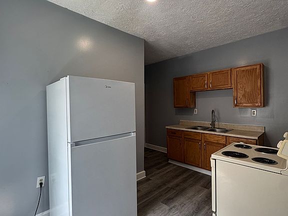 Kitchen includes electric stove, refrigerator, and wooden cabinets