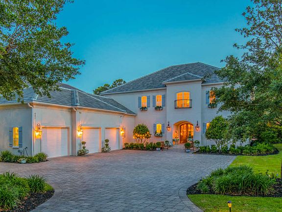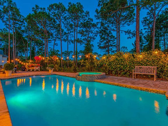 Stately custom home incorporates elegant interiors in a warm open concept floor plan in Regatta Bay. A convenient, very private first-floor mother-in-law suite with kitchen and separate entry is a welcome addition to this well-designed floorplan. High ceilings and superb detailing enhance light-filled interiors. Living spaces are classy and comfortable with first-floor concrete floors and modern brass light fixtures reminiscent of New England design. The cook's kitchen is meant for gathering and entertaining. High-end appliances, including a Thermador double oven gas range, wine cooler, and ice maker compliment the impressive design. A large island provides extra workspace, cabinets, and a bar. The custom white cabinets and Cambrian countertops complete the modern space. The kitchen opens to the beautiful large dining area overlooking the outdoor living area and pool, as well as the large family room, with space for a grand piano. The gracious first-floor master suite is sumptuously appointed with a dressing suite of custom walk-in closets, one very large, and a sitting area. A richly appointed master bath includes dual vanities, an oversized multi-jetted shower, and a garden tub. The large laundry room accommodates an extra refrigerator, cabinets, and a computer workspace. The mudroom is a welcoming space that leads to the three car garage. The grand stairway in the foyer has custom metal balusters and opens to the second floor with a window seat and a beautiful large lantern. Upstairs you'll find an oversized hallway, with room for a sitting area, an office, three large guest bedrooms with ensuite baths and walk-in closets, an office and a large game room/bunk room with eight full-sized custom built-in bunk beds. The game room has space for a pool table as well as seating for the large TV area. Two of the bedrooms open up to a wonderful balcony overlooking the golf course, providing the perfect spot for a morning cup of coffee. There are two crib closets in the bedrooms that will allow a full-sized crib and baby to be near parents but not share a room. A wonderful large walk-in attic space allows you easy access to stored items. Grounds include blooming petunias, roses, hydrangeas and mature landscaping for privacy. Entertaining continues outdoors under the large covered back patio, complete with comfortable sofas and a TV. Cool off in the heat and be refreshed with the beautiful pool and spa. A fire pit and dining area complete the space. Built by Old South Homes, no details were overlooked.The Regatta Bay lifestyle offers access to a beautiful golf course, a golf club for dining, two tennis courts, a community pool and playground. You can take a golf cart to the beach, Destin Commons, Whole Foods, LuLu's and the marina, where you can store your boat. Make this one-of-a-kind home yours.