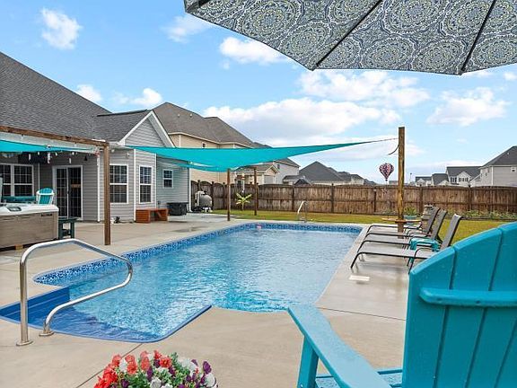 Welcome to 443 Water Wagon Trail, located in the sought-after Stateside subdivision, a community that offers a clubhouse, and convenient location close to Rock Creek Golf Course, shopping, restaurants, and area bases. This 3 bedroom, 2 bathroom home features a thoughtful split floor plan with style and comfort throughout. Step inside to the family room boasting a tray ceiling, cozy corner gas fireplace, and durable LVP flooring that flows through the main living areas and primary suite. The eat-in kitchen shines with a sunny bay window, granite countertops, stainless steel appliances, subway tile backsplash, and pantry. Sliding glass doors open to a covered patio and pool deck, perfect for summer entertaining.