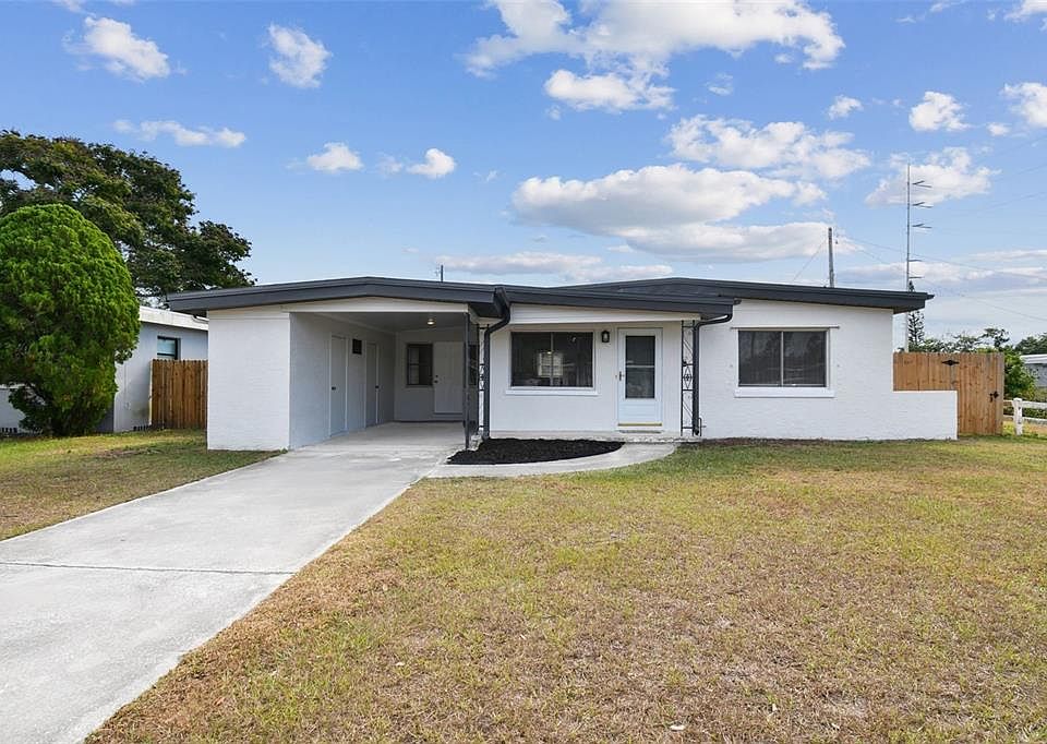 One or more photo(s) has been virtually staged. Beautifully renovated concrete block home with timeless mid-century modern appeal! This 3-bedroom, 1.5-bath property offers over 1,200 sq. ft. of living space, a covered carport and front porch, and a spacious 105 sq. ft. double-door storage/workshop in the carport. The interior is filled with natural light and feels exceptionally open thanks to vaulted ceilings in the living area and all three bedrooms. Gleaming terrazzo floors - recently polished - run throughout, and both the interior and exterior have been freshly painted. The updated kitchen features KraftMaid cabinetry with all the bells and whistles, granite countertops, under-cabinet lighting, and new stainless-steel appliances. The split floor plan places two spacious bedrooms on the west side of the home, including one with a perfect nook for a desk, conveniently located next to the fully renovated hall bathroom. On the opposite side, the generous primary suite includes a laundry closet, private updated half bath, vaulted ceilings, and direct access to the backyard. Step outside to a large concrete patio overlooking the fully fenced yard - ideal for entertaining friends and family or relaxing with a good book. This home is truly move-in ready with major upgrades already complete: Roof (2024), Mini-Split A/C for Primary Suite (2025), Central A/C (2021), Water Heater (2025), Updated Electric Panel, and Updated Windows. Centrally located in the highly desirable Disston Heights area, this home sits just minutes from Downtown St. Pete, the vibrant Gulfport Arts District, and some of the Gulf Coast’s most beautiful beaches. Enjoy easy access to dining, shopping, nightlife, art galleries, museums, festivals, and more, while still coming home to a peaceful, established neighborhood. Central to everything yet tucked away from the hustle, it’s a place where you can enjoy both an active lifestyle and quiet evenings at home. Don’t wait to schedule a tour, this home shows beautifully and will not last!
