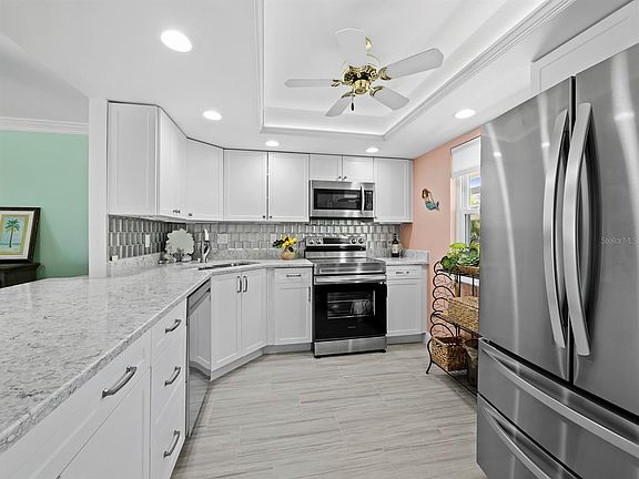 Large breakfast barWarm welcoming ambianceTray ceiling with fanPeaceful mangrove-lined viewsStone countertopsCrown moldingRecessed lighting
