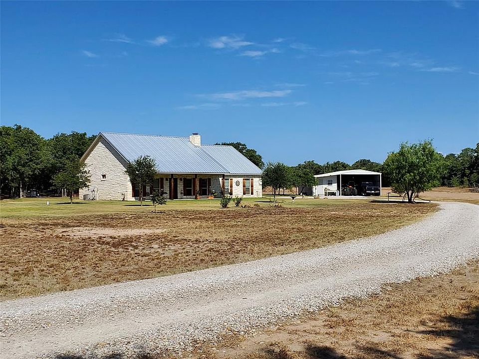 Folks, if you are wanting to move to the country,and you are looking for the right place to call home,look no further, because you have just found it!This ranchette is small enough to take care of,yet big enough to have lots of elbow rm!This home is a very nice, well kept (1943 sf under roof, with 1493 sf living area,per CAD)Austin Stone home.It has a nice open concept with living, dining, and kitchen, and high ceilings throughout home.There are 3 lrg bdrms, and 2 nice baths.The living rm has a nice wood burning fp. As you go outside, there is a large porch on front and back of home!! Other improvements include a nice small workshop, plus a shed. There is also a water well, along with county water to home.
