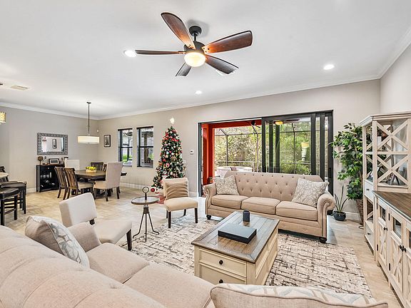 Exceptional 4-bedroom with den, 3.5-bathroom home nestled in Raffia Preserve with serene preserve views. This furnished residence offers soaring 9'9'' ceilings, intricate crown molding, 8' doors, and impact resistant windows throughout. You'll find luxury vinyl plank flooring in the large upstairs bedroom and downstairs den. The gourmet kitchen features shaker-style cabinetry, granite countertops, marble backsplash, large 6-seater center island, a pantry, and high-end KitchenAid stainless appliances. The owner's suite is generously sized with a custom walk-in closet and an ensuite with dual sinks and frameless glass walk-in shower. Outside, the private backyard oasis features a wood plank ceiling, heated pool and spa with paver deck, and a covered 4-seater outdoor bar with built-in gas grill, all under a screened enclosure with quiet preserve views. Additional perks include a den with glass French doors, paver driveway, and a 2-car garage with overhead storage racks. As a resident of Raffia Preserve, enjoy access to a clubhouse with fitness center, club room, basketball court, BBQ area, and a resort-style pool. Fantastic location, minutes from shopping, dining, and entertainment.
