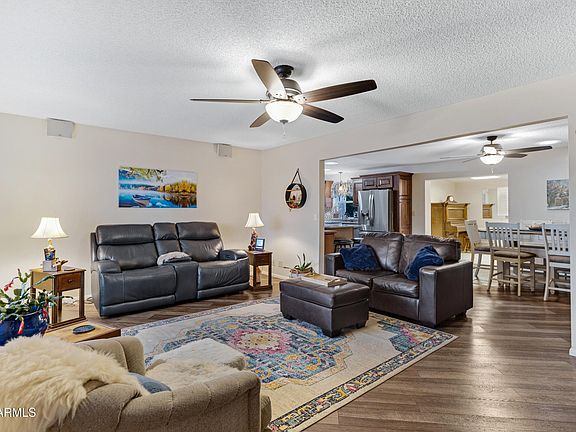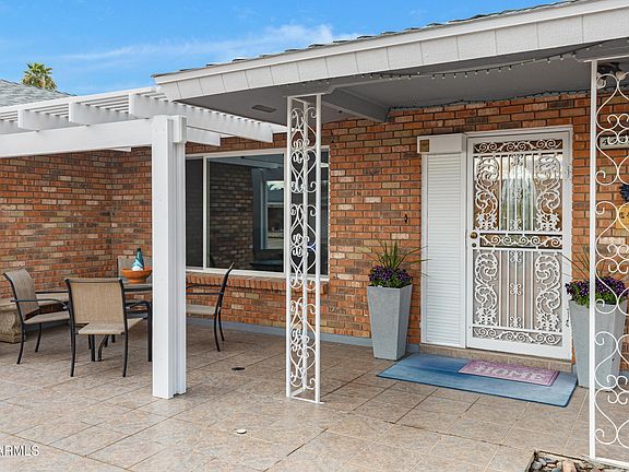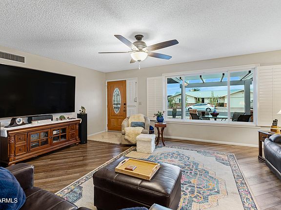 Full Time Home, Seasonal, or Investment...this home is perfect for all. Sunland Village is considered by most to be the top 55+ community in Mesa. The Popular ''600 Model'' by Farnsworth boasts a large open floor plan with great lighting and flow from living to kitchen to bedrooms. Complete with vented Arizona Room and Golf Cart Garage/Workshop. Updated paint and flooring throughout. 2023 HVAC, 2023 Water Heater, 2022 Roof, 2019 Kitchen, all attic insulation updated to R-30, plus many other updates less than 5 years old (Listed in Docs tab). Wonderful curb appeal + private, meticulous, low maintenance back yard including flowering landscape and large Ficus trees. Fridge/Washer/Dryer convey. This home is perfect for relaxing and/or entertaining.