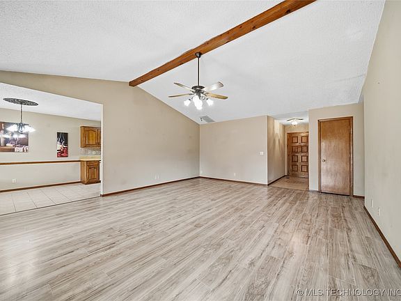 MOVE IN READY AND FULL OF CHARM! All types of buyers! Step into a welcoming foyer that opens to a spacious living room with soaring cathedral ceilings, a wood burning floor-to-ceiling brick fireplace, and large windows that fill the space with natural light and access to the patio for outdoor living. The kitchen has refinished cabinets, stylish butcher-block countertops, and a convenient pantry. Outside, relax or entertain on the covered patio overlooking a fully fenced backyard—perfect for gatherings or quiet evenings. Recent upgrades: brand-new roof, new flooring in the living room & hall, and new bathroom commodes and shower fixtures and garbage disposal. Also, approx. 2 years ago: New heat and air, water heater, smart garage door & LED spotlight and privacy fence! This location puts you super close to major amenities and the creek turnpike! You are just 5 miles from the hospital and 2.3 miles from Walmart and 2.6 miles to Sam's Club! Enjoy an abundance of major shopping, the mall, restaurants galore and entertainment along 71st street and beyond!